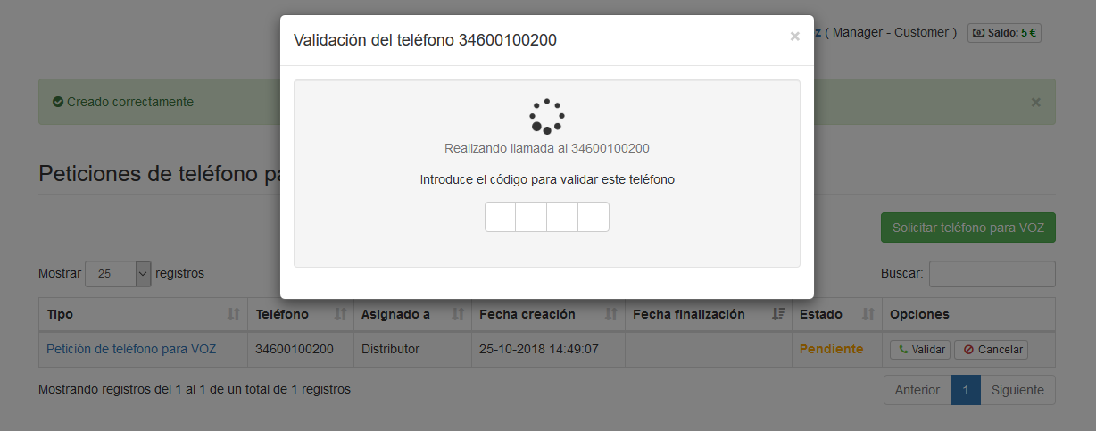 La validación automática consiste en introducir un código que obtendrás después de que nuestra plataforma realice una llamada automática al número que quieres validar. La locución de la llamada te dará el código que debes introducir para validar este número de teléfono para VOZ.