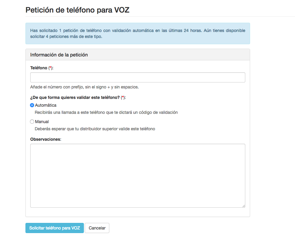 La petición de un teléfono para VOZ consiste en indicar el número de teléfono que quieres validar y como quieres que se valide el número de teléfono para que pueda ser usado.