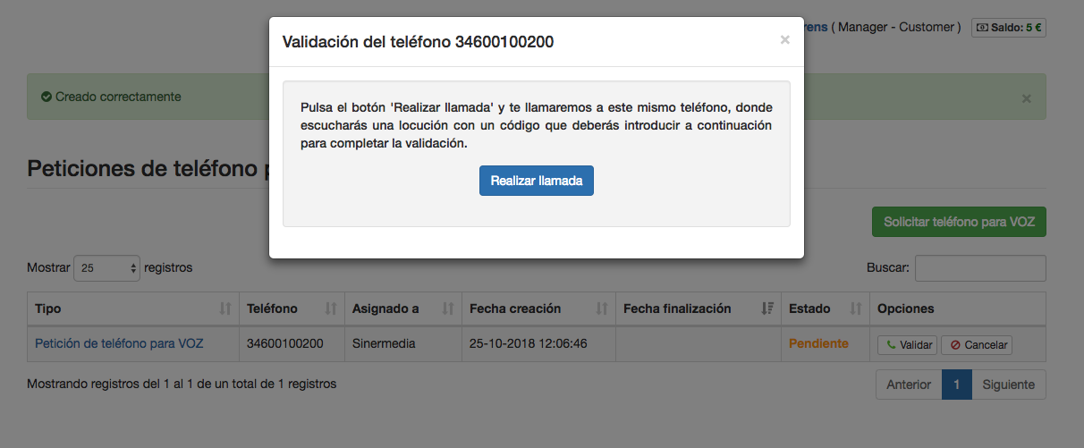 Para poder tener un nuevo remitente para tus envíos de VOZ o bien, tener un número de teléfono validado para poder realizar transferencias de llamadas, debes realizar una petición de teléfono para VOZ y que la petición se valide correctamente.